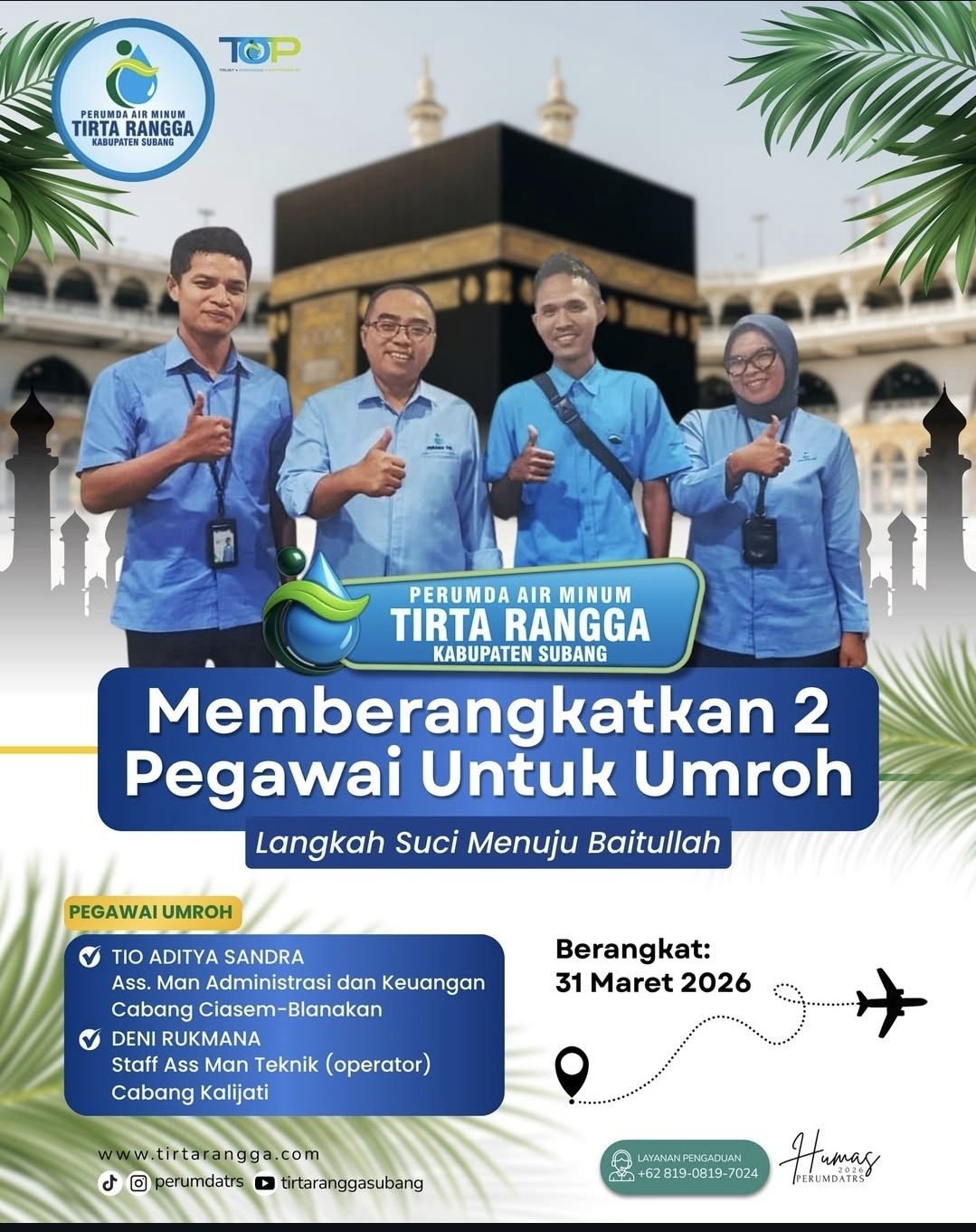 SUBANG, CLUETODAY.ID-Perumda Air Minum Tirta Rangga Subang (TRS) berangkatkan 2 karyawan umroh pada 31 Maret 2026. Pemberangkatan pegawai ini merupakan bukti dedikasi Perumda TRS kepada karyawannya.